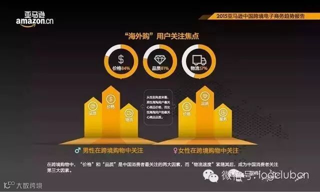 2、“价格”和“品质”是中国消费者最关注的两大因素。物流速度紧随其后,成为中国消费者关注的第三大因素。从性别角度,男性消费者最关心价格,而女性消费者最关注品质。