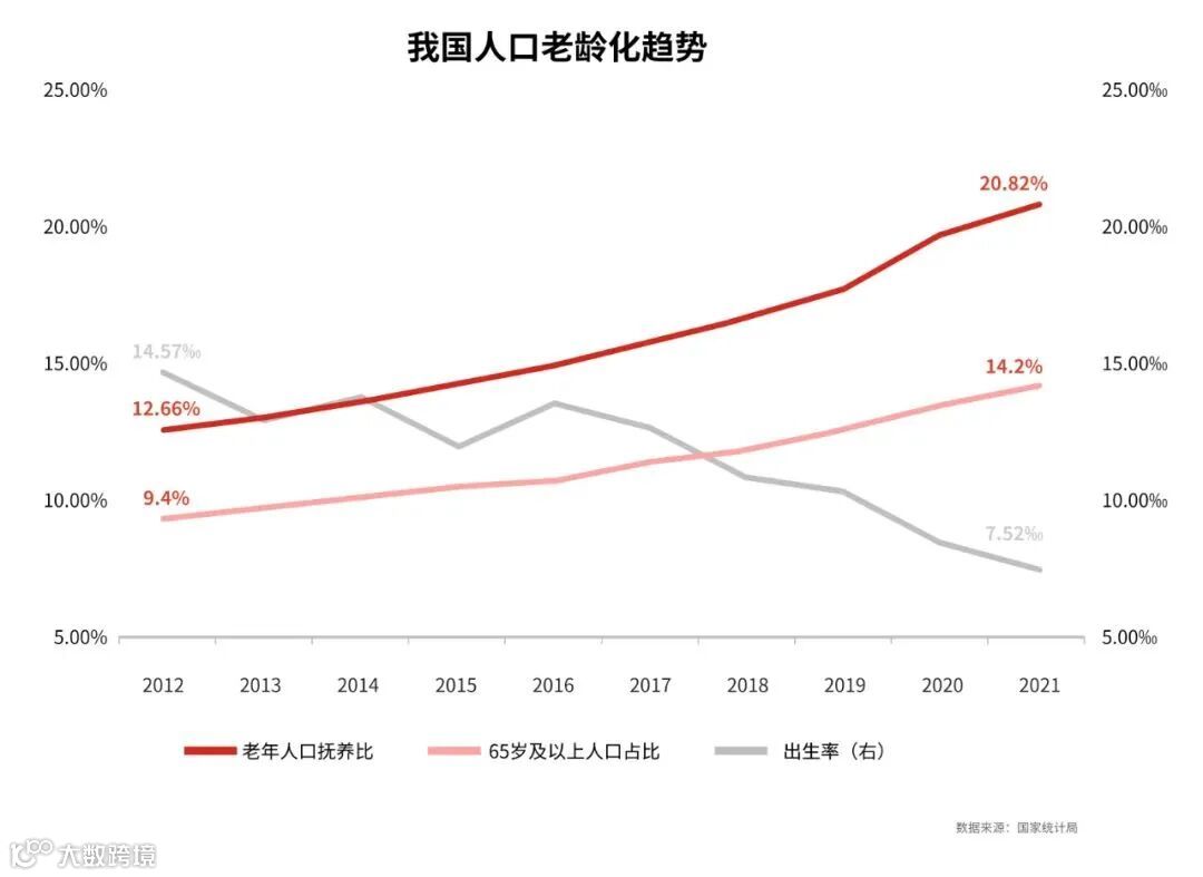 根据国家统计局数据显示,我国65岁以上人口占比由2012年的9.4%上涨到2021年的14.2%,老年人口占比逐年增加,我国已步入深度老龄化社会。国家卫健委预测,2035年左右,我国老年人口将突破4亿,中国老年人在总人口中的占比将超过30%。与此同时,我国出生率还在快速下滑,近10年的时间里,出生率下滑近一半,进一步加快了老龄化速度,养老保障需求持续提升。