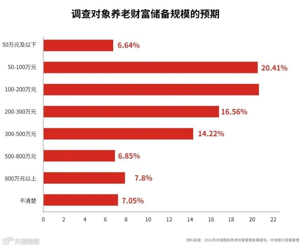 每个人对养老生活质量的目标不尽相同,我们可以从养老报告中的受访者平均期望来做一个参照值。据《2022年中国居民养老财富管理发展报告》中的调研数据显示,我国居民养老财富储备规模预期整体较高,72.94%的被调查对象认为在退休前需要攒100万元以上才能满足自己退休后的养老生活需求,中青年人对未来高质量的养老生活显现出较强的需求。这也与之前清华大学发布的《中国城市养老服务需求报告2021》中的数据比较吻合,这份报告中的受访者预计自己养老花费平均在100.6万元,30~39岁人群预计未来养老花费122.1万元。
