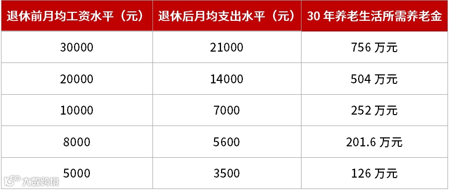 按照这个标准,不同收入人群的30年养老生活所需养老金如下表所示: