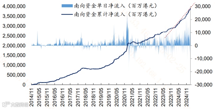2024年,南向资金连续12个月净流入港股市场;2025年1-2月,南向资金维持了前期的强势。