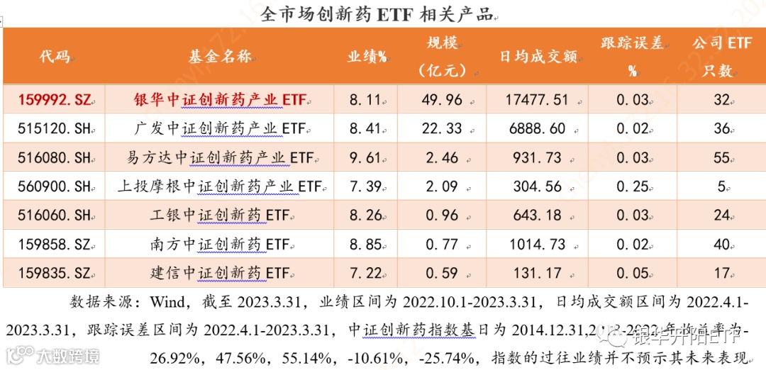 确实,从基金业绩上来看,跟踪同一条指数的几只ETF业绩基本一致,比如当前市场上有7只跟踪“中证创新药产业指数”的ETF产品近6个月以来,业绩表现无明显区别。
