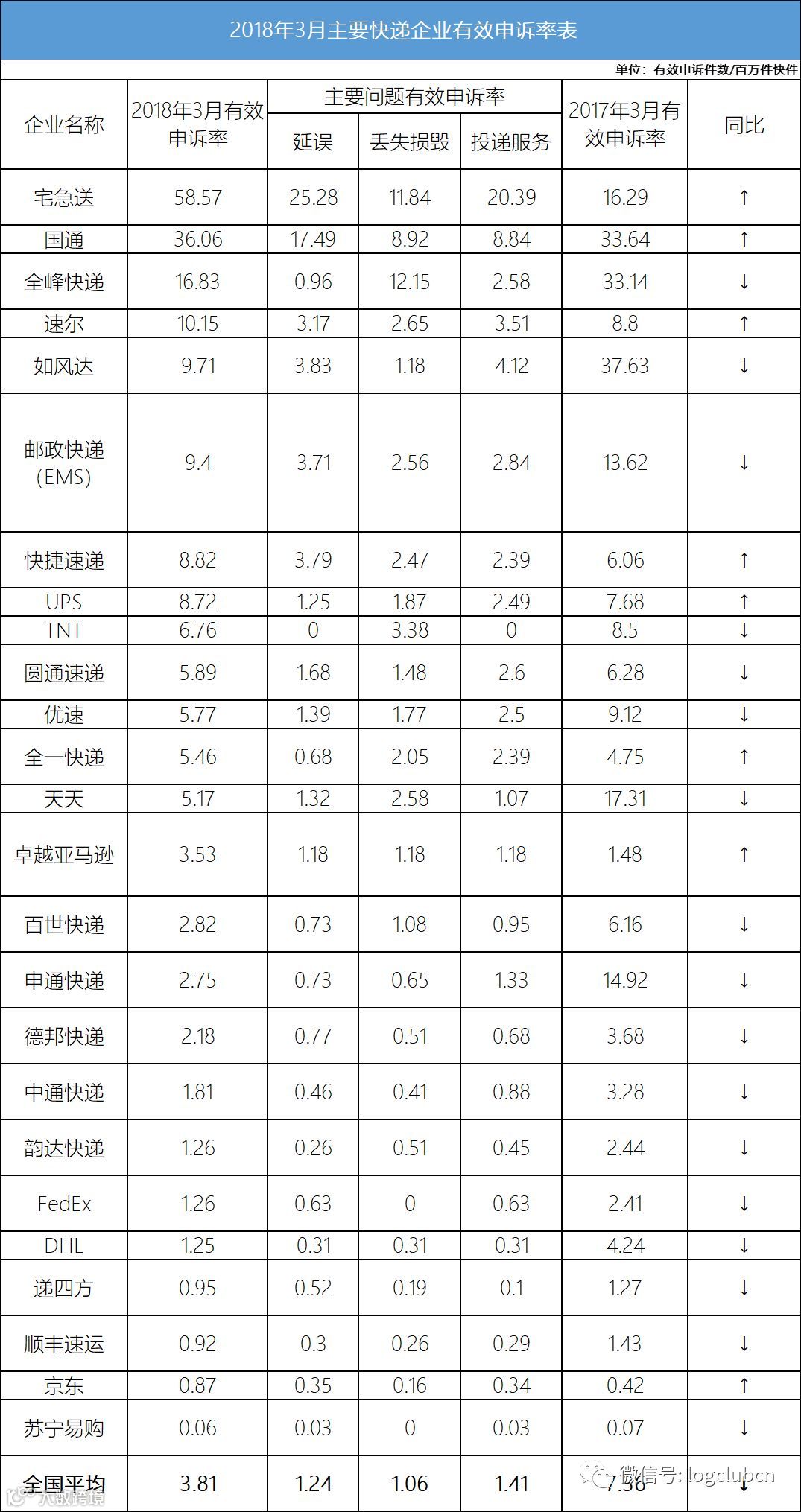 2018年3月,消费者对43家快递企业进行了有效申诉,全国快递服务有效申诉率为百万分之3.81,环比减少2.94,同比减少3.55,高于全国平均有效申诉率的快递企业有13家。