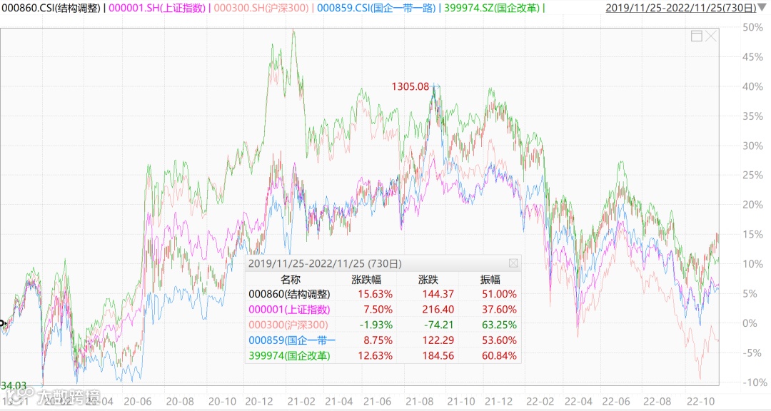 从历史走势的横向对比上看,过去三年,央企结构调整指数的收益为15.63%,优于同期上证指数、沪深300指数、国企改革指数和国企一带一路指数。