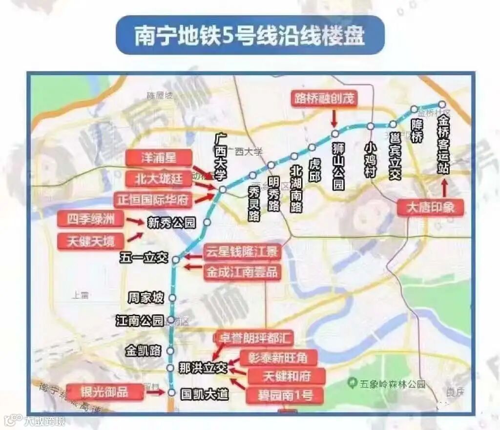 南宁轨道交通5号线一期工程(国凯大道--金桥客运站),是联系南宁西南--东北方向的骨干线,正线全长20.2公里,其中共有17座车站,可在广西大学换乘1号线,明秀路换乘2号线,小鸡村换乘3号线,那洪立交换乘4号线。
