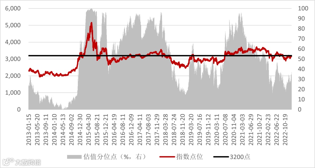数据来源:Wind,2013.1.15-2023.1.13。图中3200点交易日选取规则:每个自然年度内上证指数首次上涨超过3200点,或即将跌破3200点的交易日。指数过往业绩不预示基金未来表现。