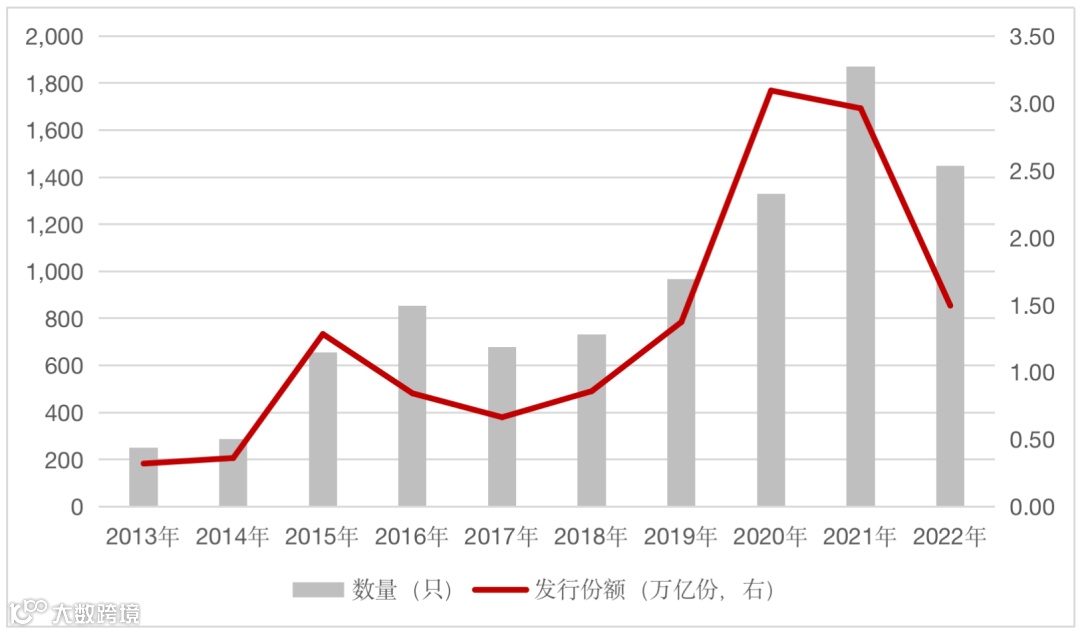 投资者情绪是一个较为难以量化的指标,但我们可以通过新基金发行热度间接地度量投资者情绪。投资者对于新基金的购买力度,往往反映了投资者情绪。我们从近10年新基金的发行情况可以看出,2022年新基金的发行数量和份额较2021年出现明显下降,并且爆款基金也少之又少,体现了投资者情绪过冷。