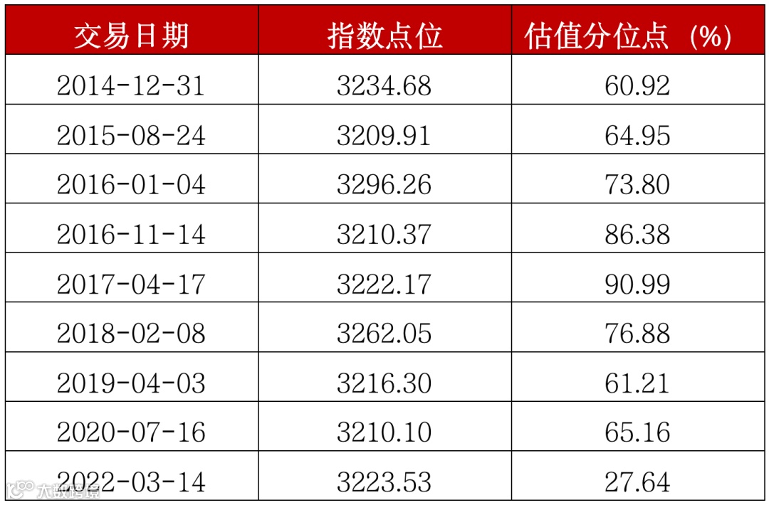 回顾近10年上证指数估值可以发现,尽管点位都处于3200点附近,但估值分位点相差甚远,最大值为90.99%,最小值仅为27.64%。