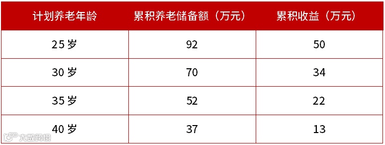 假设分别从25岁、30岁、35岁、40岁起规划养老,每年年末固定为养老储备12000元,直至60岁退休,年收益率为4%。从以下数据可以看出,越早规划养老,累积的养老储备额与实现的收益也就越多。