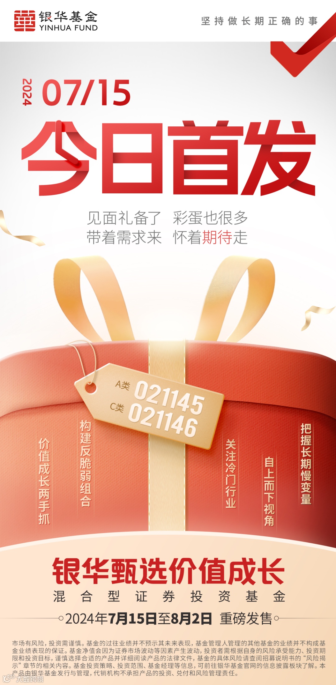 投资有风险,投资需谨慎。基金是一种长期投资工具,其主要功能是分散投资,降低投资单一证券所带来的个别风险。基金不同于银行储蓄等能够提供固定收益预期的金融工具,当您购买基金产品时,既可能按持有份额分享基金投资所产生的收益,也可能承担基金投资所带来的损失。