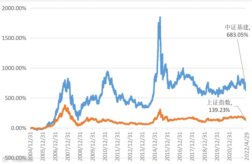 (数据来源:Wind,截至2022.4.29。中证基建指数基日为2004.12.31日,指数近5年涨跌幅为2017年-2.68%,2018年-26.98%,2019年8.00%,2020年5.18%,2021年16.78%。指数过往业绩不预示基金未来表现。)