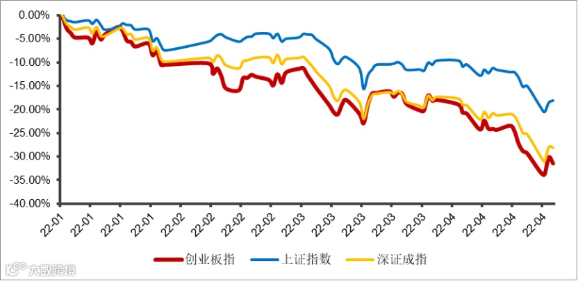 近期“新冠”疫情在上海、吉林两地集中爆发,并蔓延至全国多地,对疫区居民的生产生活造成了严重干扰,截至现在还没有实质性好转的表现。本轮疫情对经济影响较大,3月规模以上工业增加值同比增速较 1-2 月下降 2.5pct 至 5.0%,3月社消零售总额 3.4 万亿,同比下降 3.5%,较 1-2 月下降 10.2pct,出现 2020 年 8 月以来的首次负增长。(数据来源:招商银行研究院)本轮疫情爆发对市场情绪面也产生较大影响,对A股市场造成一定拖累。年初至今上证指数下跌-18.25%,深证成指下跌-28.46%,创业扳指下跌-32.96%。(数据来源:Wind,截至2022.04.28)