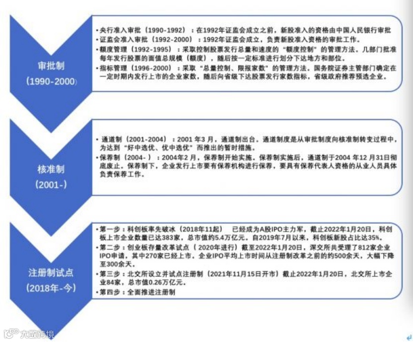 资本市场改革一直在持续推进,从2019年6月到2021年11月,科创板、创业板、北交所相继设立及改革,同时试点注册制。2021年3月,十四五规划纲要提出全面实施注册制,建立常态化退市机制,提高上市公司质量。2021年4月,深交所主板与中小板合并,为全面注册制打下基础。2021年12月10日,中央经济工作会议提出全面实施注册制,2022年全面注册制有望落地。