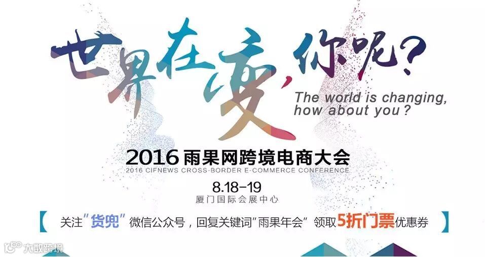 好消息!现在关注【货兜】微信公众号,回复关键词“雨果年会”,即可领取8.18-8.19雨果网2016跨境电商大会门票5折优惠券(仅限普通票使用),数量有限,先到先得! 货兜作为此次雨果网年会的合作商之一,届时也将在现场与雨果网共同举办有奖互动活动,只要关注【货兜】微信公众号或下载货兜APP及注册货兜账号等,前往货兜展位即可出示凭证领取精美礼品,更可以参加“最省钱跨境人”终极挑战活动,赢取kindle等千元大奖!