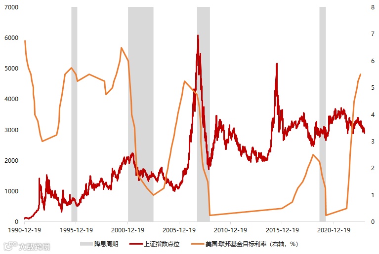 1990年以来上证指数走势与美国联邦基金目标利率变化对比