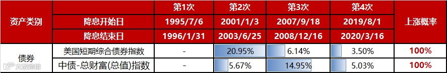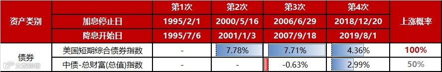 在政策观察期,流动性预期的改善以及经济走弱的环境均指引着美债利率的下行,而债券价格与利率呈反比,所以,美债表现的强势成为了共同特征。