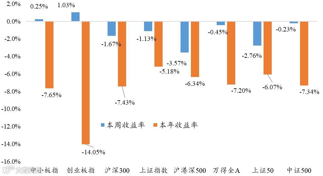 本周市场主要宽基指数走势分化。万得全A下跌0.45%,沪深300下跌1.67%,创业板指上涨1.03%。