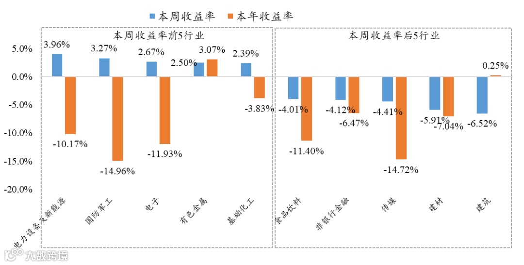 本周涨幅居前的行业为电力设备及新能源、国防军工、电子、有色金属、基础化工,本周收益率分别达3.96%、3.27%、2.67%、2.50%、2.39%。食品饮料、非银行金融、传媒、建材、建筑为本周收益排名靠后的行业。
