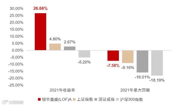 自王海峰管理银华鑫盛(LOF)A以来,始终执行“均衡配置”的策略,Wind和托管行复核数据显示,王海峰任职以来至2021年末,该基金的基金净值从0.7760增长至2.5130,任期累计收益率223.42%,超越同期比较基准194.86%。在获得较为丰厚回报的同时,王海峰管理以来不断优化组合的风险收益比,2021年,银华鑫盛(LOF)A累计回报为26.66%,最大回撤仅为-7.58%,低于大盘主流指数。