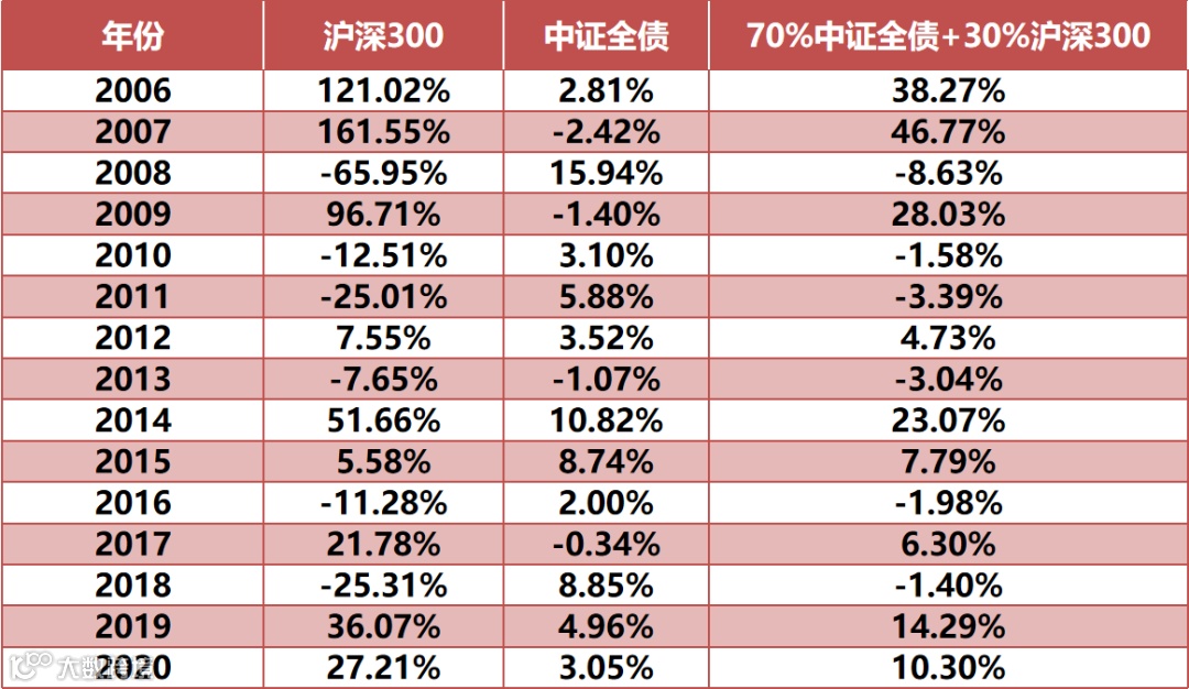 Wind数据显示,在沪深300指数大跌65.95%的2008年,经过股债配置的组合年度亏损缩窄至8.63%,而在2008年之外的年份,投资组合的最大年度亏损不超过4%。可见,该组合兼顾了收益率与波动率的优势,整体收益较为平稳且波动相对沪深300较小。
