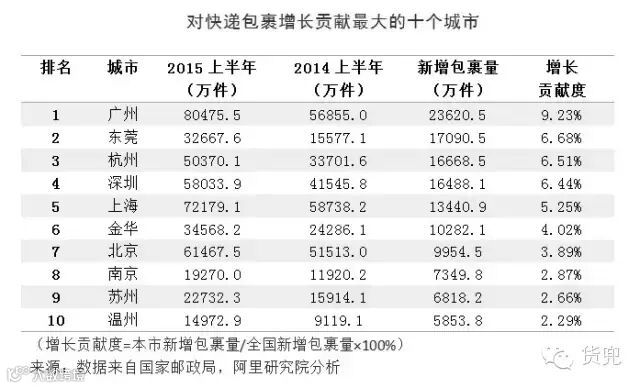 2015年上半年,全国快递包裹同比增长25.6亿件。阿里研究院分析发现,对快递包裹增长贡献最大的前三个城市是广州、东莞和杭州,排名第四至第十位的城市依次为深圳、上海、金华、北京、南京、苏州和温州。这十个城市新增的包裹量合计占全国的49.3%,撑起半壁江山。从地理分布来看,六个城市位于长三角,三个位于珠三角。