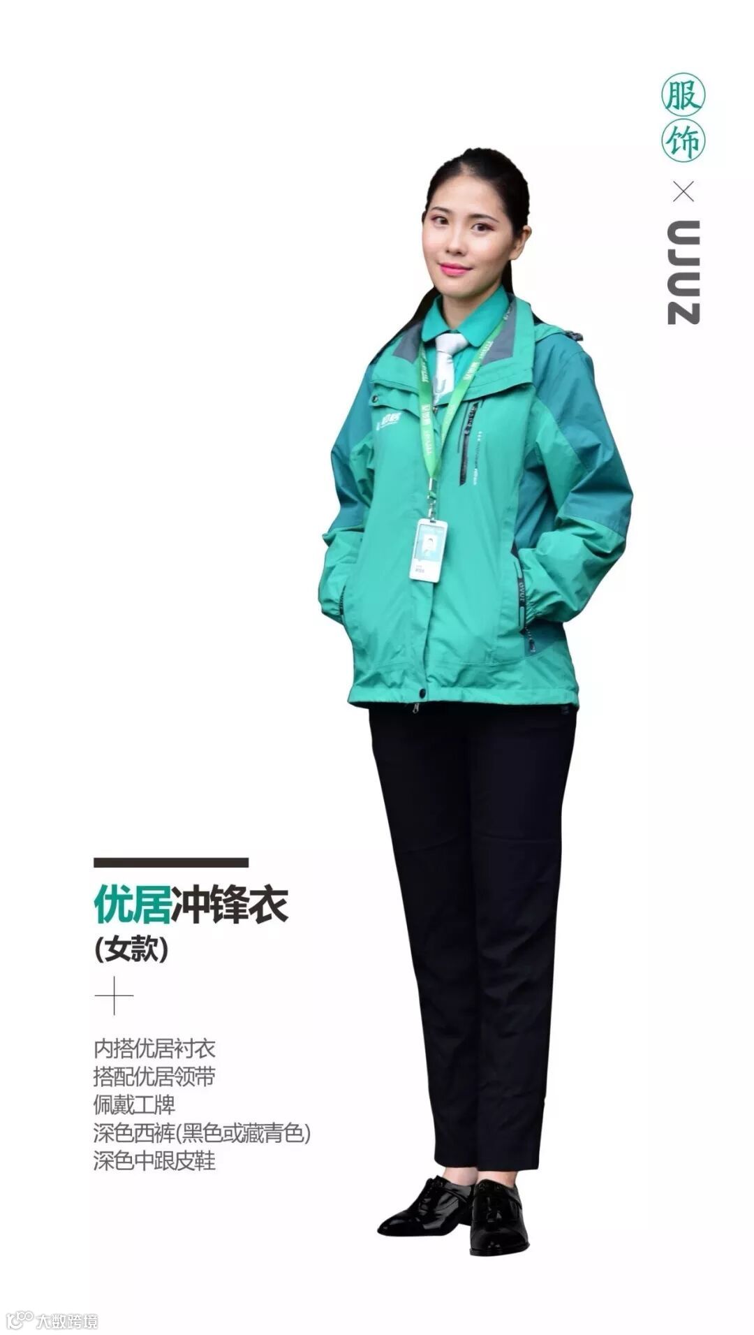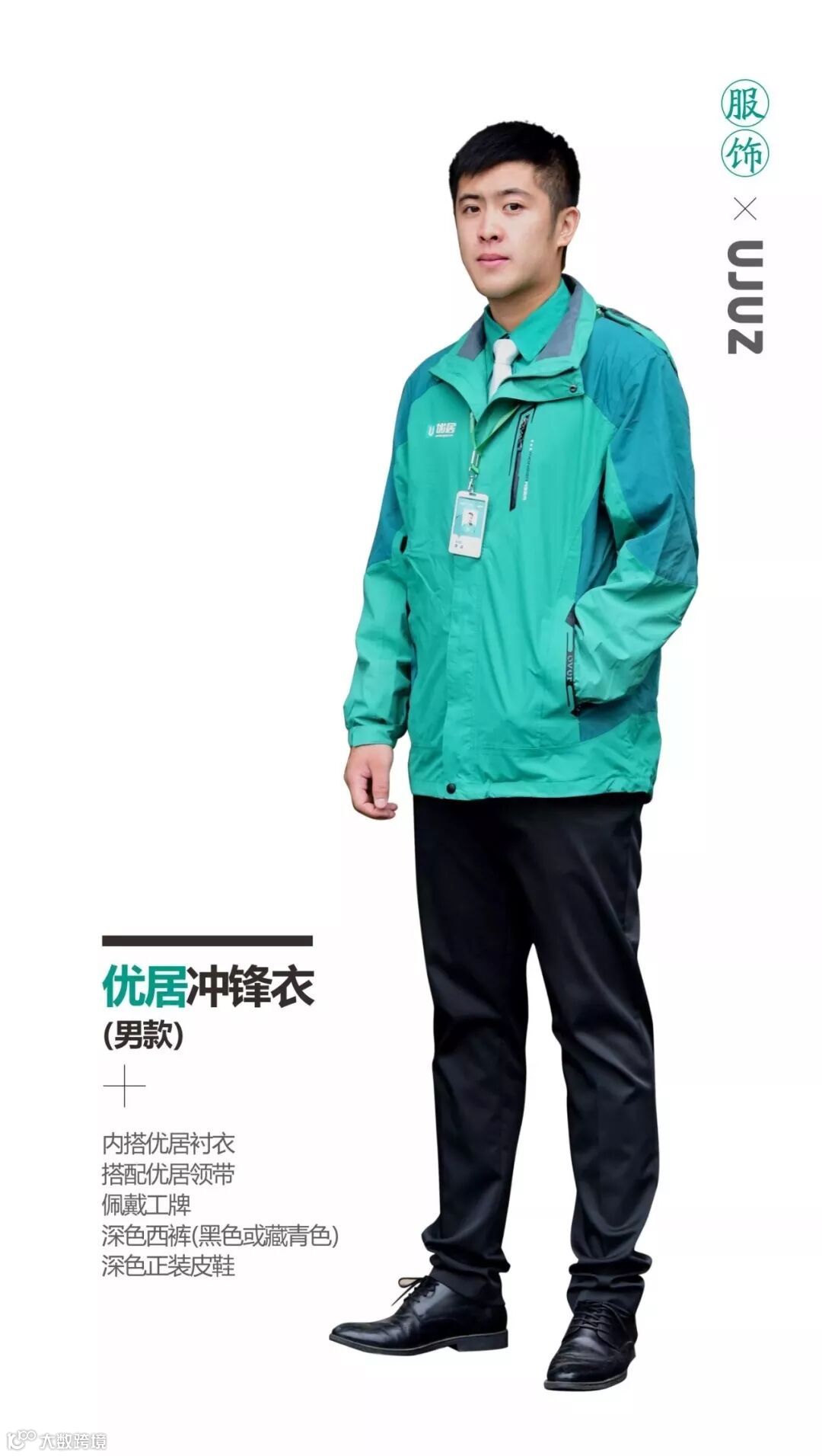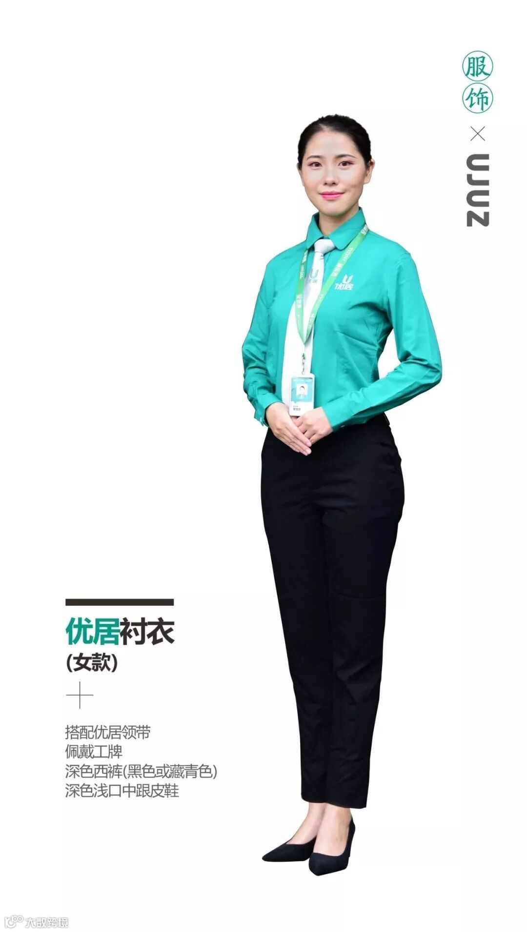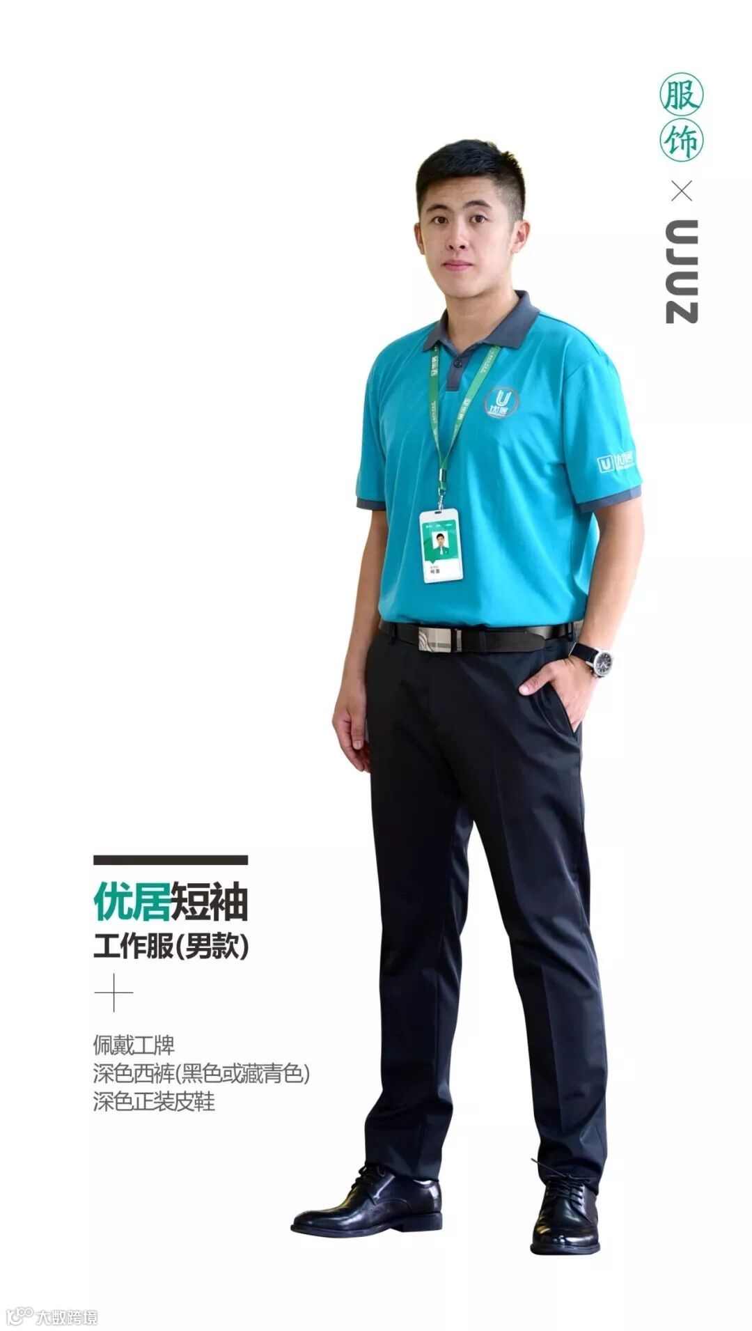 男士:男士仪表整洁,上身着衬衫或优居工作服,下身着西裤配皮鞋,并要求束腰、佩戴工作牌。