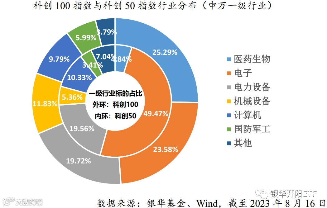 从行业分布来看,科创50指数近50%权重集中在电子行业,相比之下,科创100指数更加均衡地配置医药生物、电子、电力设备、机械设备等行业。
