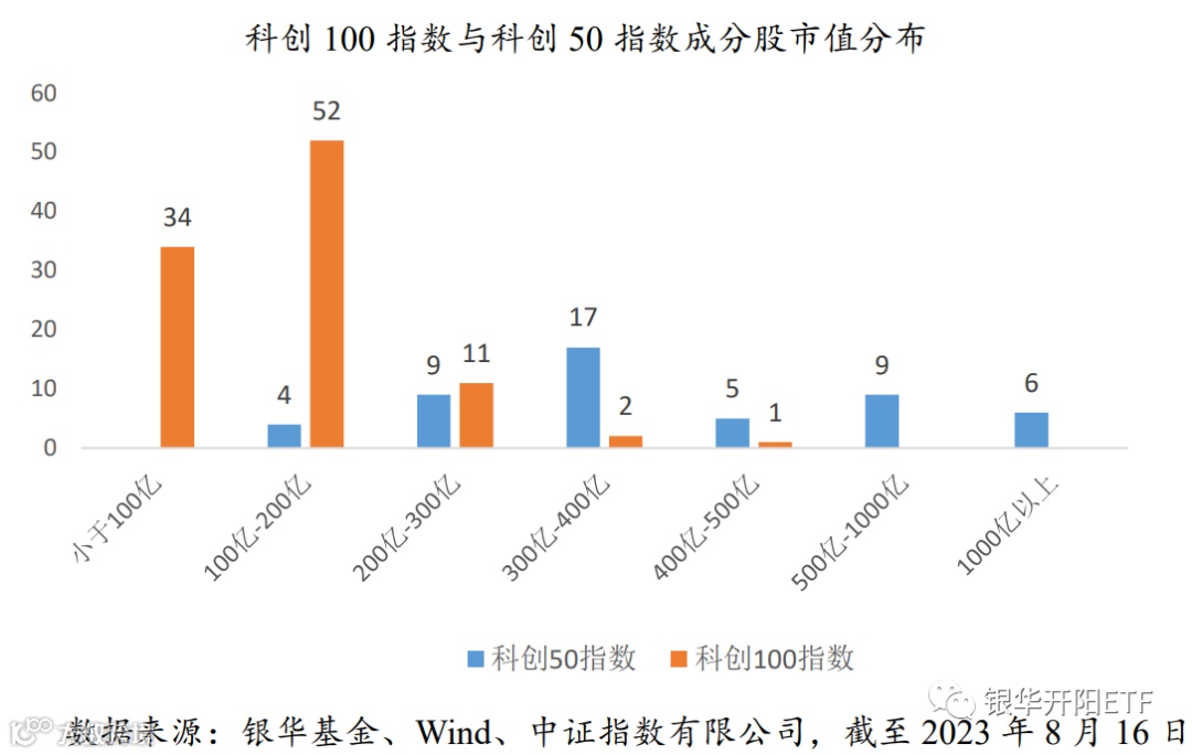 从市值分布来看,截至2023年8月16日,科创100指数样本总市值主要分布在50亿元至280亿元之间,其中市值规模低于200亿元的样本占比86%。样本市值的中位数约为130亿元,介于中证500指数和中证1000指数之间,与科创50指数样本的市值中位数354亿元形成显著差异。