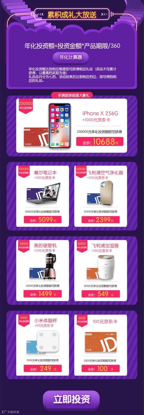 活动期间,投资满一定年化投资收益即可获得相应礼品,更有iPhone X等你拿!