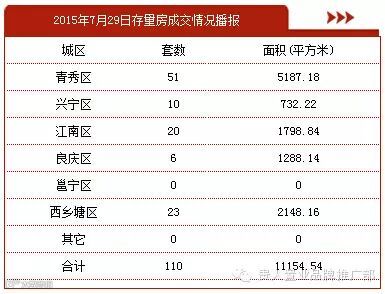 2015年7月29日,南宁商品房签约339套,签约面积27649.33平方米。其中,青秀区151套,兴宁区42套,江南区40套,良庆区29套,邕宁区38套,西乡塘区39套。