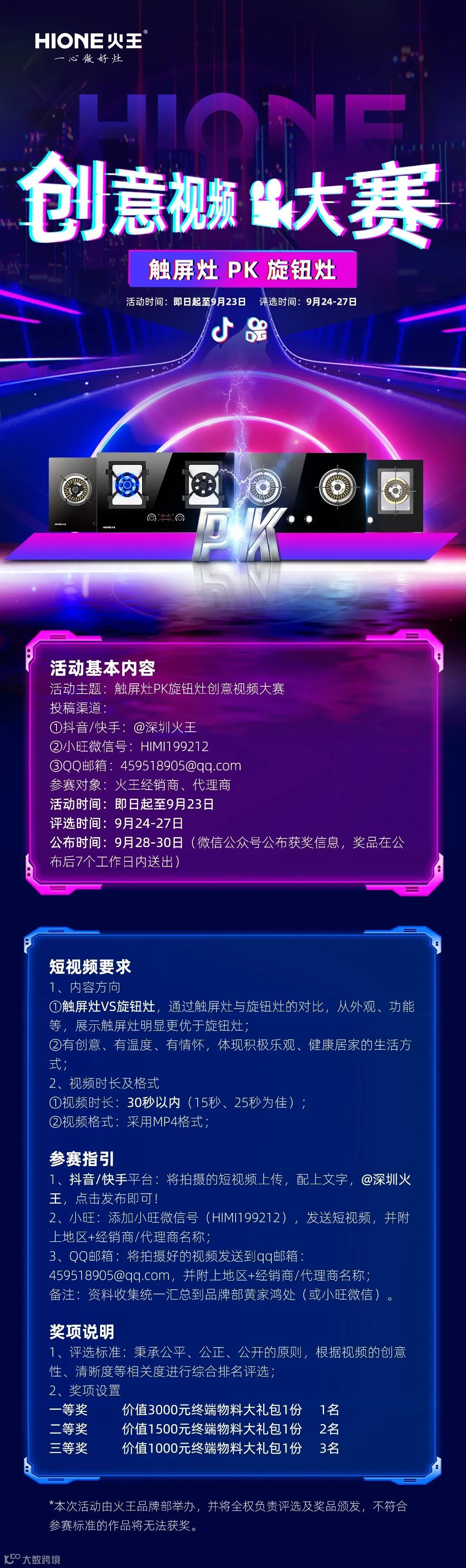 为快速提升火王家人们对触屏灶产品的关注和了解,进一步激发学习热情,集大家智慧!汇众合力量!对此,公司从即日起到9月23日,将开展触屏灶PK旋钮灶创意视频大赛。