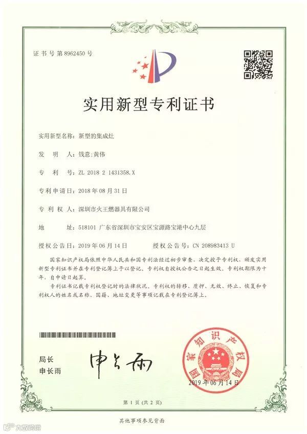 日前,公司收到国家知识产权局专利局发来的《授予发明专利权通知书》,火王又一项新型的集成灶发明获得国家实用新型专利授权,专利号ZL 2018 2 1431358.X,为公司发明专利锦上添花,有效的保护了核心产品的知识产权。