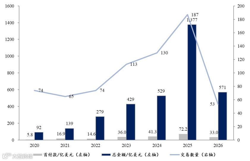 更可喜的是,单项交易对价持续提升。据Evaluate数据,中国创新药企BD授权的平均首付款从2022年的5200万美元提升至2026年1-2 月的1.72亿美元,涨幅高达230%,标志着中国创新药的全球认可度提升,合作信任体系逐渐建立。