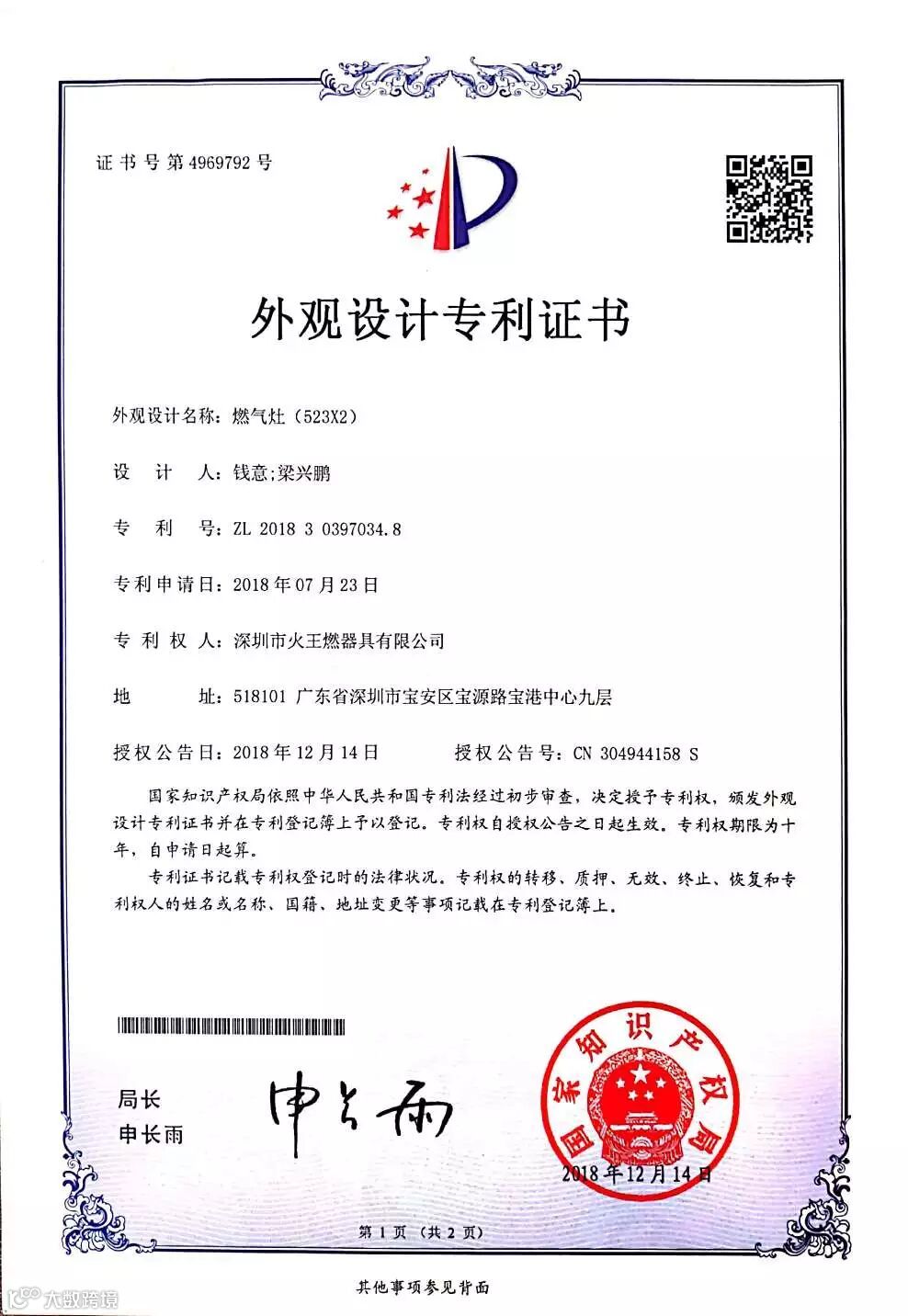 在国家知识产权局授权门槛日增的背景下,日前,火王再获由国家知识产权局授予的外观设计专利证书,专利号 ZL 2018 3 0397034.8,该项专利是火王重要的无形资产,进一步提升火王在厨电设计领域的影响力,同时也对知识产权进行了全方位保护。