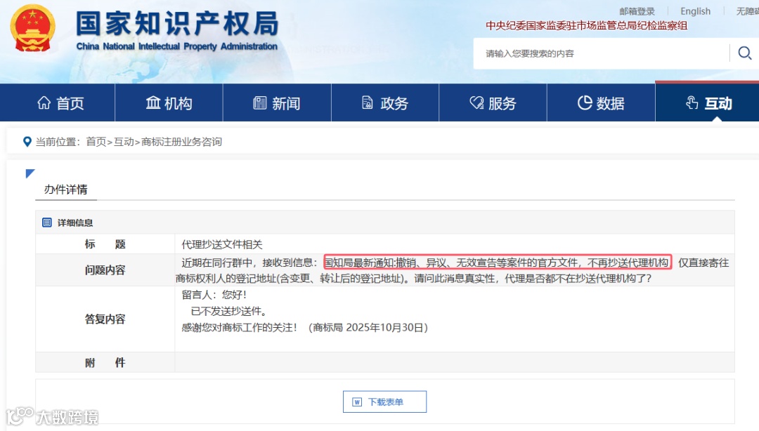 近期,国家知识产权局商标局在公开咨询回复中明确了一则重要信息:商标撤三、异议、无效宣告等案件的官方文件,不再向代理机构发送抄送件,仅直接邮寄至商标权利人登记的商标地址。
