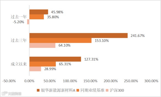 银华新能源新材料量化股票发起式A于2017年9月15日成立,2018年、2019年、2020年、2021年、自基金合同生效起至今的净值增长率依次为-29.77%、23.39%、89.68%、129.49%、45.98%、127.31%。同期业绩比较基准收益率依次为-29.40%、19.52%、55.94%、66.24%、 35.80% 、65.31%。