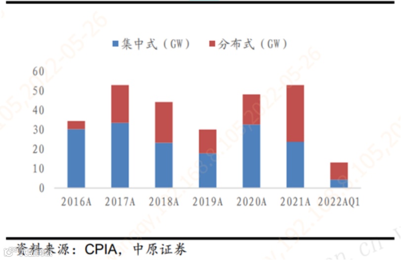 2021年,中国光伏新增装机55.48GW,同比增长13.9%,分布式装机约29.28GW,占全部新增装机的53.4%,户用装机达21.6GW,同比增长113.3%,2022年Q1,国内太阳能发电新增装机13.21GW,同比增长147.8%,其中,集中式光伏新增装机4.34GW,同比增长72.22%,分布式新增光伏装机8.87GW,同比增长215.66%。(数据来源:Wind,中原证券研究院)
