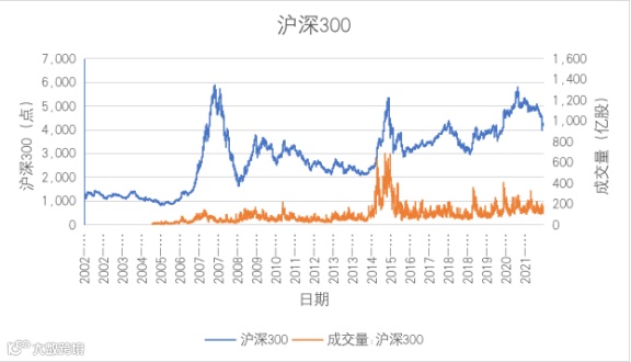李求索:这两个问题都很难。我也从图表开始,2002年到现在一共二十年的时间,最开始2002到2005年或者再往后一点,从2002年到2012年的十年。最开始的第一个问题,我说基本面的周期,这里面包括经济的周期,经济的周期开始的波长比较长,现在稍微缩短了一些。从股市的周期来看也是类似的情况,这二十年如果分拆,前面的十年波长较长,后面的十年波长稍短。2002年到2005年的时间是比较明显的熊市环境,当时这个市场大概跌了有四年的时间,四年的“漫漫熊图”。看指数,成交的方面,到2005年之前是没有的,因为那时候沪深300这个指数都没有,沪深300是从2005年之后开始有指数,那时候我们重点看的是另外一个宽基指数——上证综指。在2002年到2005年,2005年差不多接近1000点的点位了,当时有很多人在2005年都处于比较明显恐慌的环境。