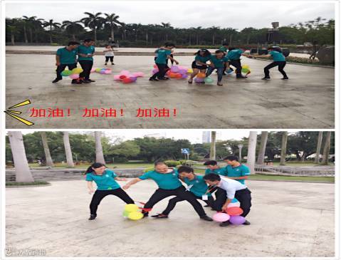 在激烈的竞争下,我们黄队的小伙伴们在第一个游戏比赛中获得第一名!接下来是两人三足踩气球!