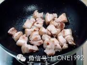 4. 把五花肉块用中小火煸出油,肉块煸至颜色微黄捞出备用。