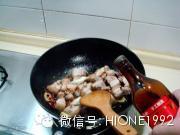 7. 爆出香味儿后,倒入煸好的五花肉块炒匀,然后烹入绍酒炒匀。
