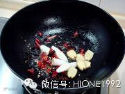 6. 煸出香味儿后下入葱段、姜片和干辣椒煸炒。