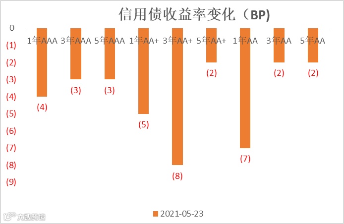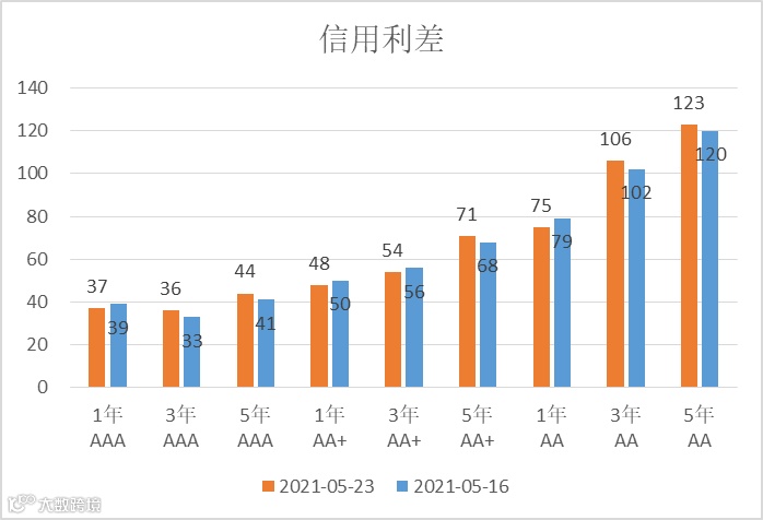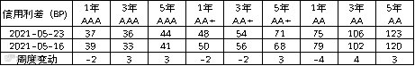 由于 1 年期国开收益率仅下行 2bp,长端下行较多,导致短期限的信用利差跟随收益率收窄,1 年期各等级的信用利差下行 2~5bp,而 3 年期和 5 年期的信用利差整体略有走阔。