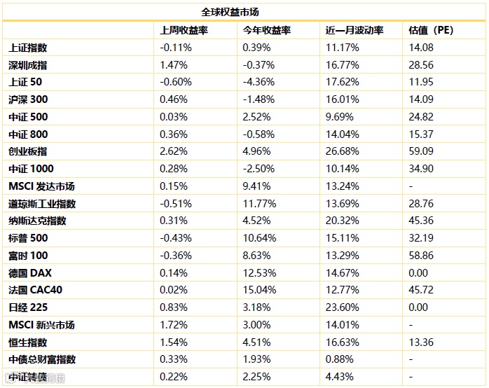 全球市场观察。上周全球主要经济体股市呈震荡趋势,美国纳斯达克上涨0.31%,标普500下跌0.43%。德国DAX上涨0.14%、法国CAC40上涨0.02%,富时100下跌0.36%。亚洲市场,日本日经225指上涨0.83%,香港恒生指数上涨1.54%。