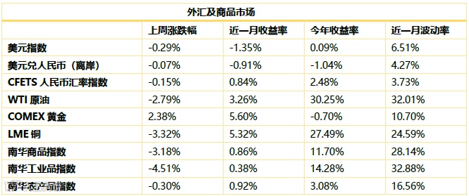 商品市场综述:上周商品市场继续下跌。南华商品指数下跌3.18%,南华工业品指数下跌4.51%,南华农产品指数下跌0.30%。WTI原油下跌2.79%,COMEX黄金上涨2.38%,LME铜下跌3.32%。