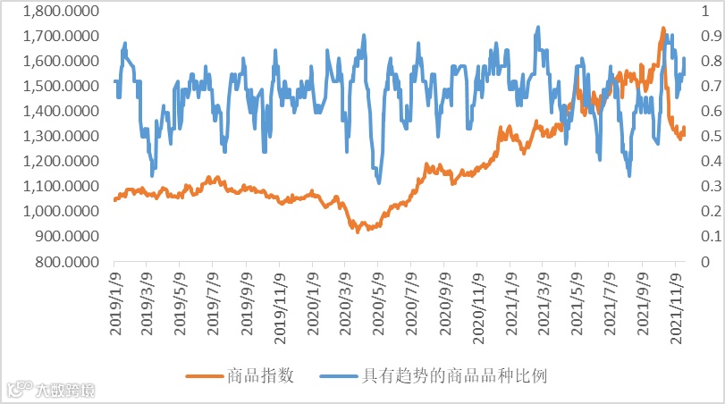 商品策略。具有趋势效应的商品上升至75%,商品指数继续回落。目前可以考虑配置CTA策略。