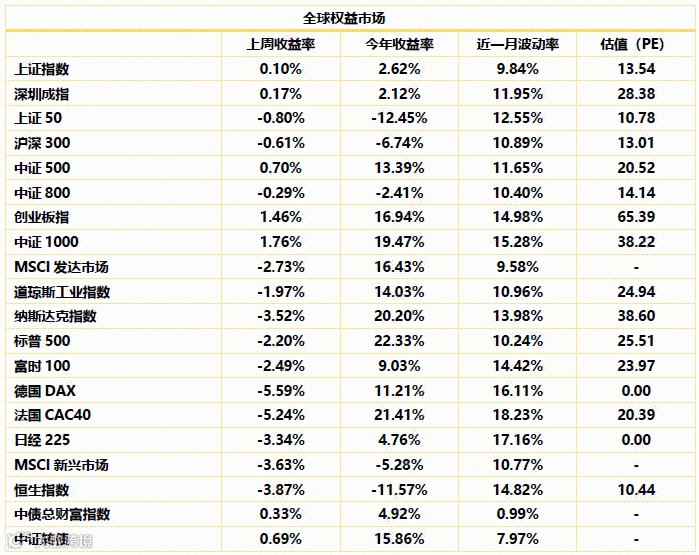 全球市场观察。上周欧美主要经济体股市周中跳水,美国纳斯达克下跌3.52%,标普500下跌2.20%。德国DAX下降5.59%、法国CAC40下跌5.24%,富时100下跌2.49%。亚洲市场,日本日经225指数下跌3.34%,香港恒生指数下跌3.87%。
