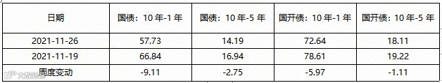 上周各期限国债、国开债信用利差收紧,10Y-1Y期利差收紧明显。