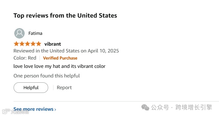 “Best Seller”只有一个买家秀? 有细心卖家发现,那顶号称Best Seller、售价47刀的红帽子,在其商品页面下(截图时)居然只有一个评价/买家秀 ?(如下图所示,一位叫Fatima的用户给了五星好评,说颜色很“vibrant”)。一个评论就能支撑起Best Seller?这不禁让人对数据的真实性打个问号。 -