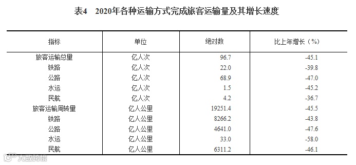 全年旅客运输总量97亿人次,比上年下降45.1%。旅客运输周转量19251亿人公里,下降45.5%。